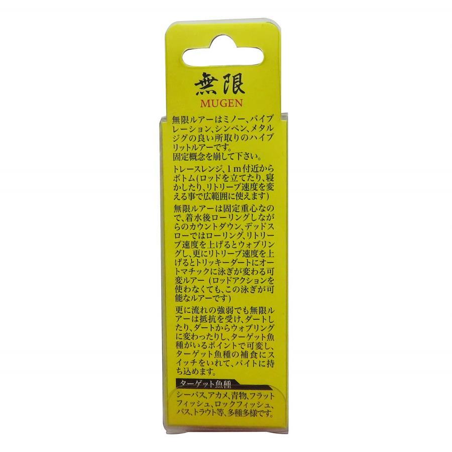 無限ルアーはミノー、バイブレーション、シンペン、メタルジグの良い所取りの ハイブリットルアーです。固定概念を崩して下さい。キャスト飛距離-80m(PE1.5号、ラインを濡らしての実測) トレースレンジ-1m付近からボトム(ロッドを立てた寝かしたり使い分け、リトリーブ速度の調整で1mより表層をトレースも可能) ルアースイム-固定重心なので、着水後ローリングしながらのカウントダウン、デッドスローでは ローリング、リトリーブ速度を上げるとウォブリングし、更にリトリーブ速度を上げると不規則な ダートにオートマチックに泳ぎが変わります。(ロッドアクションを使わなくてもこの泳ぎが可能なルアーです)更に流れの強弱でも無限ルアーは抵抗を受け、ダートしたり、ダートからウォブリングに変わったりし、ターゲット魚種がいるポイントで可変し、ターゲット魚種の捕食にスイッチをいれて、バイトに持ち込みます。貫通ワイヤーなので、ビッグシーバス、アカメ、青物等のパワーファイトにも対応。