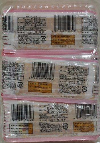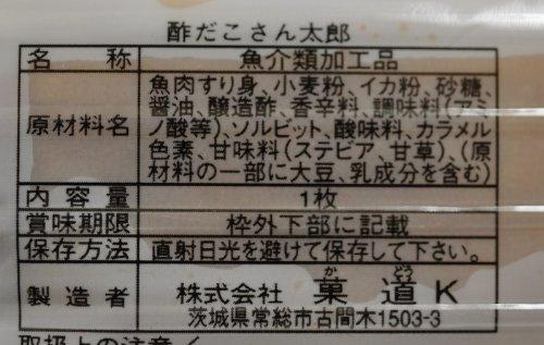 原材料:魚肉すり身、小麦粉、イカ粉、砂糖、醤油、醸造酢、香辛料、調味料(アミノ酸等)、ソルビット、酸味料、カラメル色素、甘味料(ステビア、甘草)、(原材料の一部に大豆、乳成分、カニを含む)