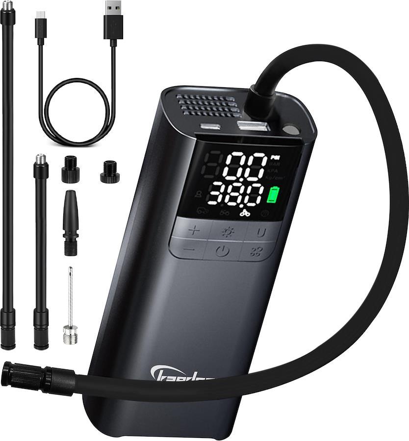 【商品仕様】■シリンダー数:1気筒、■回転数:15000RPM、■排気量:3.4CC(15-18 L/min)■最大吐出圧:150PSI、■電池容量:デュアルバッテリー2000mAh/7.4V合計4000mAh/14.8wha、バッテリー駆動時間:15-20 mins、■動作電流:1.6-5A/無負荷1.6A、40PIS以上の負荷3.5-5A、■充電:5V2A/タイプC、■充電時間:2~3時間、■空気圧単位:PSI、BAR、KPA、Kg/cm2、■空気圧上限:999KPA、■モーター寿命:700h、LED電力:1W、■プロテクション:モーター温度保護:65℃/モーターストール過電流保護:8A/バッテリー過電流保護10A/バッテリー過充電保護8.4V/バッテリー過放電保護6V、■サイズ:縦152mm、横68mm、奥46mm、重さ:442g、 ■使用温度:-10~45度、 ■連続稼働時間:10分以内、■商品内容:本体、エアーホース30cm×1本、15cm×1本(米式)、仏式アダプター、英式アダプター、ニードル、浮き輪ノズル、充電ケーブル、収納袋