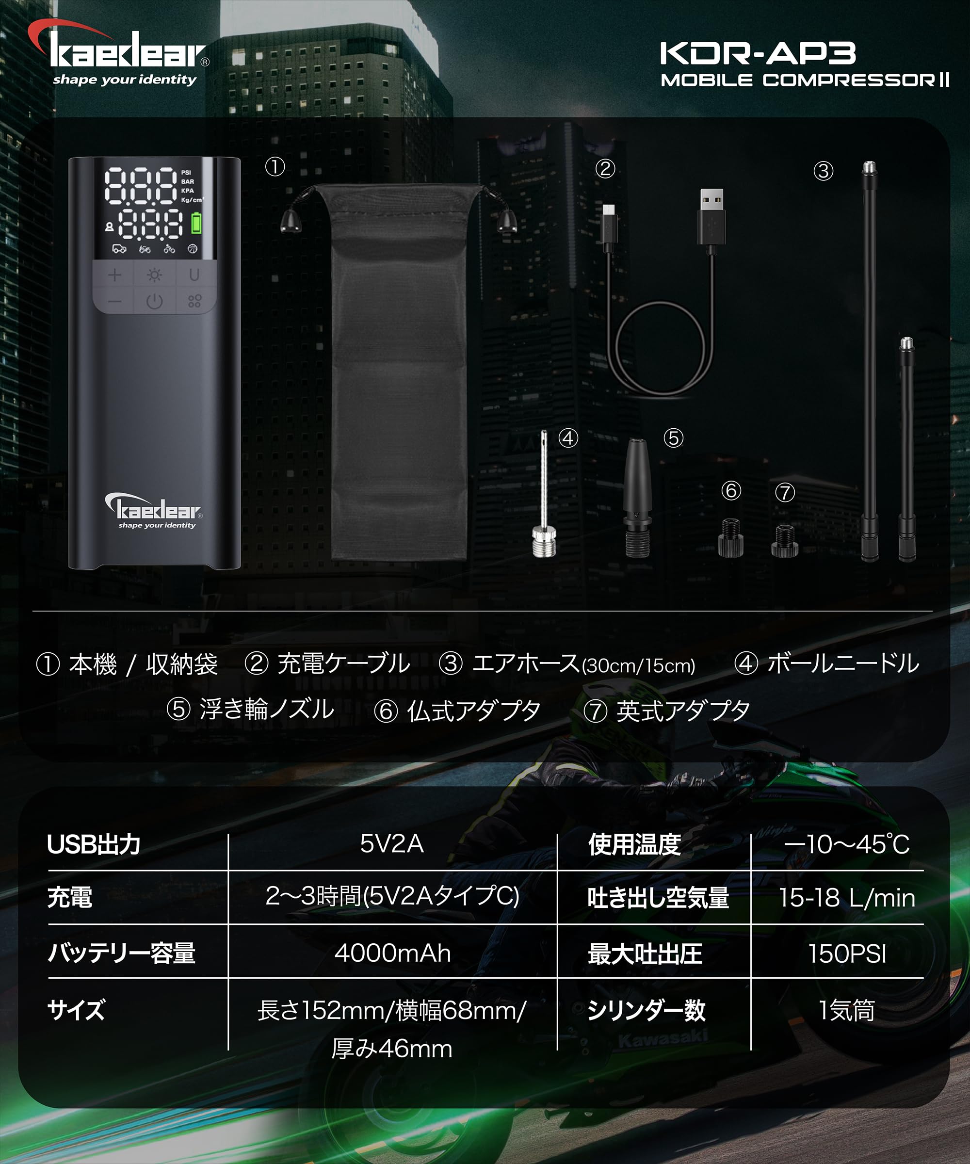 【モバイルコンプレサー2024年モデル】 空気圧調整が自宅やツーリング先で手軽に行える充電式電動エアーポンプ。バイク以外にも車のタイヤの空気圧調整や自転車の空気入れとしてもご使用頂けます。物理ボタンは作業中にグローブをしたまま空気圧調整が可能。指定した空気圧まで自動的に充填します。 【今までできなかったことがこれ一台で完結】 ・適正空気圧を保つことでタイヤの変摩耗防止や燃費の向上。・USB電源(5V2A)搭載で電子機器の充電も可能。・ボールや浮き輪の空気入れ等レジャーでも活躍。・パンク修理後の空気の充填。・ロードコンディションに合わせた空気圧調整。・LEDライトで暗い場所や夜間にも活躍。 【商品仕様】 ■シリンダー数:1気筒、■回転数:15000RPM、■排気量:3.4CC(15-18 L/min)■最大吐出圧:150PSI、■電池容量:デュアルバッテリー2000mAh/7.4V合計4000mAh/14.8wha、バッテリー駆動時間:15-20 mins、■動作電流:1.6-5A/無負荷1.6A、40PIS以上の負荷3.5-5A、■充電:5V2A/タイプC、■充電時間:2~3時間、■空気圧単位:PSI、BAR、KPA、Kg/cm2、■空気圧上限:999KPA、■モーター寿命:700h、LED電力:1W、■プロテクション:モーター温度保護:65度/モーターストール過電流保護:8A/バッテリー過電流保護10A/バッテリー過充電保護8.4V/バッテリー過放電保護6V、■サイズ:長さ152mm、横幅68mm、厚み46mm、重さ:442g、 ■使用温度:-10~45度、 ■連続稼働時間:10分以内、■商品内容:モバイルコンプレッサー、エアーホース30cm×1本、15cm×1本(米式バルブ)、仏式バルブアダプター、英式バルブアダプター、ボールニードル、浮き輪ノズル、充電ケーブル、収納袋 ■取扱説明書(オンラインのみ):環境負荷の軽減を目指した脱炭素化への取り組みとして、紙媒体での同封を控えさせていただいております。Kaedear公式サイトの各商品ページから閲覧またはダウンロードが可能です。 【注意事項】 ①ご使用の際は85db程の音が発生します。使用する環境によって反響する事があり、うるさく感じる事がございます。 ②本製品は空気を圧縮し排出する為、高温になります。使用には問題はございません。また長時間の連続使用は控えて頂きホース等の高温になりやすい箇所は直接お手を触れないようご注意ください。 ③ホースが適切についていない場合、ホース内部に異物がある場合、誤作動の原因となる場合がございます。誤作動や不具合、違和感を感じた場合は本体+-ボタンを5秒以上長押しして頂きリセットをして頂く事で改善される場合がございます。 【メーカー保証】 ■メーカー保証期間:1年(ご購入日と同日が期限) カエディアではお客様にご満足頂ける様、販売後もサポートさせて頂きます。 商品のご不明な点はもちろん、バイクへのお取り付けに関するご相談は、国家整備資格を保有したスタッフがおりますので、専門知識に対しても的確に対応させて頂きます。 万一、製品不良に起因する不具合と診断される場合は、弊社のメーカー保証規定に基づき審議させて頂き、メーカー保証による無償での修理、交換を行わせて頂きます。業務用に使用される際は、メーカー保証期間を半分の期間とさせて頂きます(例:メーカー保証期間が1年の場合、6ヶ月となり、ご購入日の月に6ヶ月を加算した同日が期限)詳細は公式サイト内メーカー保証規定をご覧下さい。 お取り付け後、ご使用後でも、対応させて頂きます。日本メーカーとして、おもてなしの心で対応致します。先ずはお気軽にご相談下さい。