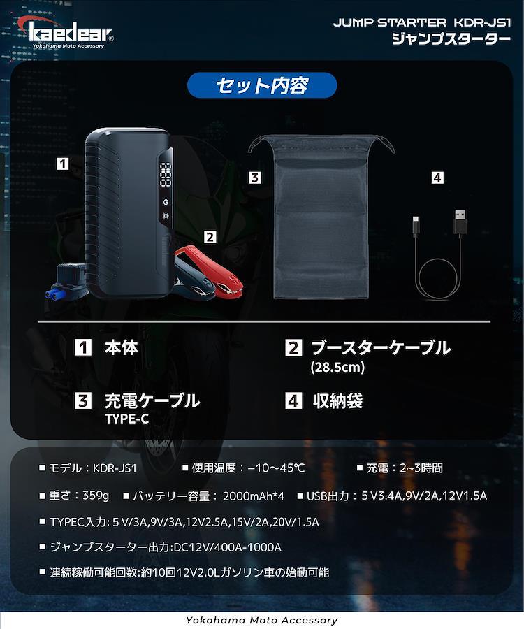 【バッテリー上りはこれ一台で完結】 コンパクトかつ高出力なモバイルジャンプスターターです。内蔵されたリチウムバッテリーにより、12V車両のバッテリー上がり時にエンジンを始動させることが可能です。1台でジャンプスターター・モバイルバッテリー・LEDライトの3役をこなすシンプル設計。軽量で持ち運びやすく、バイクに車載しておくことで急なバッテリ上がりによるエンジン始動不可に対してジャンプスタートでエンジン始動が可能です。「バッテリーの製造年月日が古くなっていても、まだ使えるから早めのバッテリー交換はもったいない。」、「冬になると急にバッテリーが上がるから夏以降はバッテリーを交換しないと不安。」、「バッテリー充電器は持っていても、すぐにエンジンが掛けられないとツーリングの待ち合わせに間に合わない。」、そんな不安や悩みをお持ちの方に、心強い1台です。【製品の特徴】 ●バッテリー上がり時でも素早くエンジン始動が可能。 ●USBポート搭載でスマートフォン等のモバイル機器も充電可能。 ●LEDライト搭載で夜間の緊急時の作業にも便利。 ●軽量コンパクトな設計で収納しやすく持ち運びにも最適。 ●リチウムポリマーバッテリー搭載で繰り返し充電・使用が可能。 ●バイクへの接続を考慮した、長めの配線と小型クランプのブースターケーブルを採用。 ●ジャンプスタート後は自動的に電源がOFFになる安全設計。 【製品の詳細】 ■バッテリータイプ:リチウムポリマー ■バッテリー容量:2000mAh×4 / 29.6Wh ■ジャンプスタート対応:12V車両(バイク・乗用車) ■ジャンプスタート定格電流:400A(瞬間最大電流1000A) ■USB出力:5V/3A、9V/3A、12V/2.5A、15V/2A、20V/1.5A ■LEDライト機能:点灯/点滅/SOS ■本体サイズ:162×85×35mm ■重量:約359g ■使用可能温度:-10~45℃ ■商品内容:ジャンプスターター本体、ブースターケーブル(長めの28.5cm配線・小型クランプ)、充電ケーブル(タイプC)、収納袋 ■取扱説明書(オンラインのみ):環境負荷の軽減を目指した脱炭素化への取り組みとして、紙媒体での同封を控えさせていただいております。Kaedear公式サイトの各商品ページから閲覧またはダウンロードが可能です。 【予めご了承ください。】 ① 本製品は12Vバッテリー搭載車専用です。6Vおよび24V車には使用できません。 ② バッテリーの状態によっては、エンジンが始動できない場合があります。 ③ カプラー接続タイプのバッテリー車両では、クランプの直接接続ができません。ご使用には事前の配線加工が必要です。 ④ 長期間使用しない場合でも、3か月に一度の補充電を推奨しております。 ⑤ 完全放電を繰り返すと、内蔵バッテリーの寿命が短くなる恐れがあります。 【メーカー保証】 ■メーカー保証期間:1年(ご購入日と同日が期限) カエディアではお客様にご満足頂ける様、販売後もサポートさせて頂きます。 商品のご不明な点はもちろん、バイクへのお取り付けに関するご相談は、国家整備資格を保有したスタッフがおりますので、専門知識に対しても的確に対応させて頂きます。万一、製品不良に起因する不具合と診断される場合は、弊社のメーカー保証規定に基づき審議させて頂き、メーカー保証による無償での修理、交換を行わせて頂きます。業務用に使用される際は、メーカー保証期間を半分の期間とさせて頂きます(例:メーカー保証期間が1年の場合、6ヶ月となり、ご購入日の月に6ヶ月を加算した同日が期限)詳細は公式サイト内メーカー保証規定をご覧下さい。お取り付け後、ご使用後でも、対応させて頂きます。日本メーカーとして、おもてなしの心で対応致します。先ずはお気軽にご相談下さい。