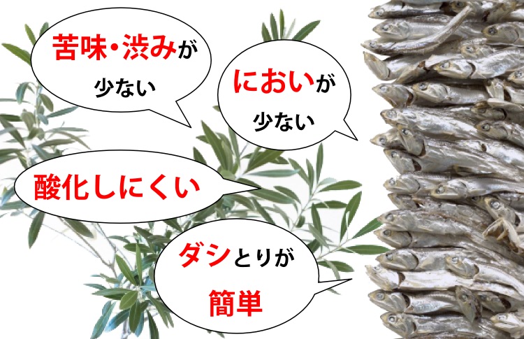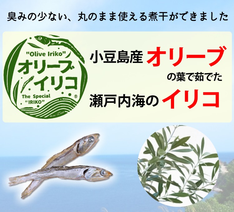 瀬戸内海で獲れたイリコを、香川県・小豆島産オリーブの葉を乾燥・粉砕したものを加えて茹でました。オリーブの葉と一緒に茹でられたイリコは、苦味や渋みが少なく、においも抑えられています。 また、脂の酸化による変色が緩やかです。普段のお料理にはもちろん、おやつやおつまみとしてもお召し上がりいただけます。■原材料 : かたくちいわし(香川県産)、食塩、オリーブ葉粉末■賞味期限 : 製造日より6ヶ月 別途ラベルに記載■保存方法 : 直射日光、高温多湿を避けてください。開封後は冷蔵庫(10℃以下)