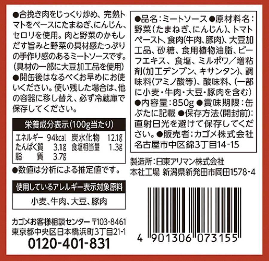 原材料:野菜(たまねぎ、にんじん)、トマトペースト、食肉(牛肉、豚肉)、大豆加工品、砂糖、食用植物油脂、ビーフエキス、食塩、ミルポワ/増粘剤(加工デンプン、キサンタン)、調味料(アミノ酸等)、酸味料、(一部に小麦・牛肉・大豆・豚肉を含む)内容量:850g×3個カロリー:100g当り カロリー:94kcal商品サイズ(高さx奥行x幅):24cm×20cm×20cm炒めた合挽き肉、たまねぎ、にんじんを完熟トマトでじっくり煮込んだやさしい味わいのミートソースです。【重要】メーカーによる商品リニューアルに伴いパッケージ(内容量も含む)変更が行われた場合、新パッケージでお届け致します事ご了承願います。