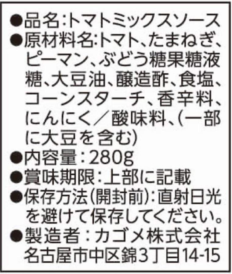 トマト、たまねぎ、ピーマン、ぶどう糖果糖液糖、大豆油、醸造酢、食塩、コーンスターチ、香辛料、にんにく、酸味料