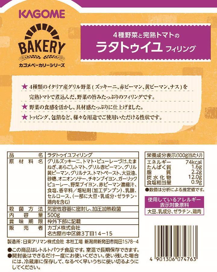 「カゴメ 4種野菜と完熟トマトのラタトゥイユフィリング 500g」は、4種類のイタリア産グリル野菜(ズッキーニ、赤ピーマン、黄ピーマン、ナス)を完熟トマトで煮込んだ、野菜の旨みたっぷりのフィリングです。野菜の食感を活かし、具材感たっぷりに仕上げました。トッピング、包餡など、様々な用途でご使用いただける性状です。