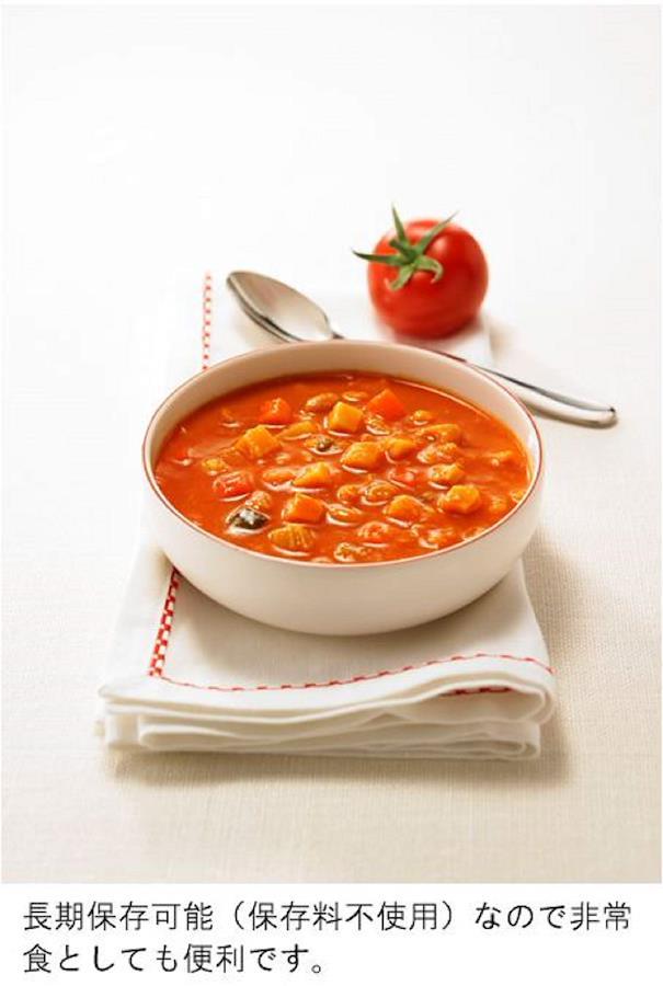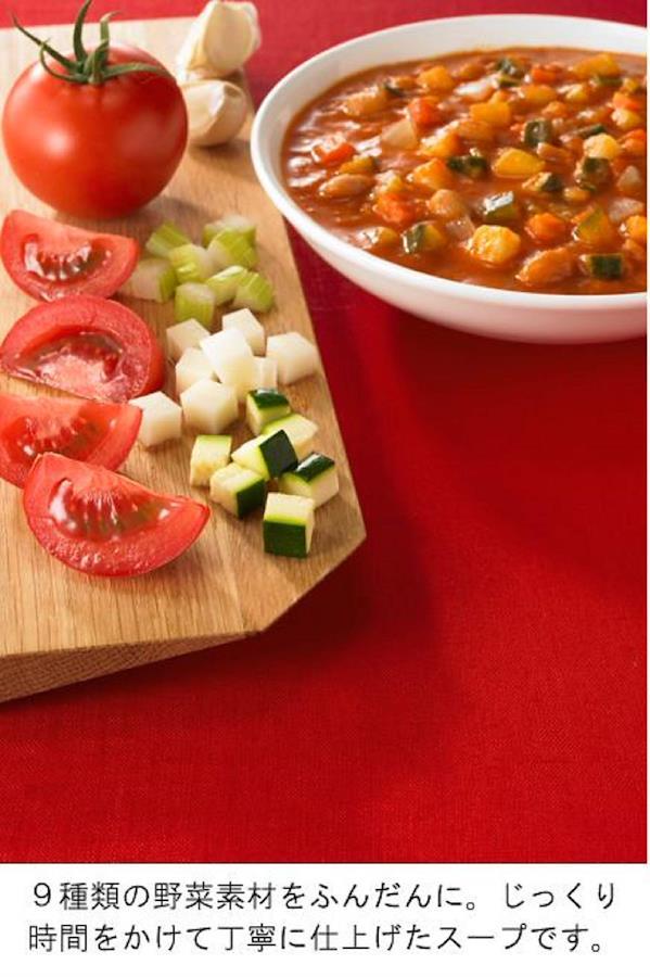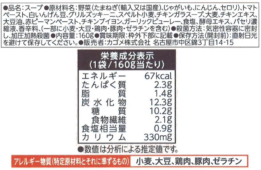 野菜(たまねぎ(輸入又は国産)、じゃがいも、にんじん、セロリ)、トマトペースト、白いんげん豆、グリル ズッキーニ、スペルト小麦、チキンガラスープ、大麦、チキンエキス、大豆油、赤ピーマンペースト、チキンブイヨン、ガーリックピューレー、食塩、酵母エキス、パセリ濃縮液、香辛料、(一部に小麦・大豆・鶏肉・豚肉・ゼラチンを含む)
