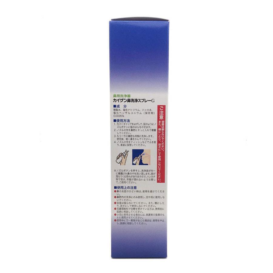 鼻腔の花粉、ほこり、雑菌をスッキリ洗い流す。 爽快!ミントタイプ ●使用方法● 1.カバーキャップをはずして、ノズルボタンに指のはらをのせます。 2.ノズルの先を鼻腔にそっと入れて噴霧してください。 3.もう一方の鼻腔も同様に洗浄します。使用後、軽く鼻をかんでください。 4.ノズルの先をティッシュなどでふき取り、清潔に保管してください。 ※ノズルボタンを押すと、洗浄液が均一に噴霧され鼻の中を洗い流します。 液が落ちてくる恐れがありますので、ハンカチ等で受け、洋服が濡れないよう注意して、 ご使用ください。 ●使用上の注意● ・鼻の炎症のひどい時は、使用を避けてください。 ・鼻腔内の洗浄にのみ使用し、目や耳に使用しないでください。 ・容器は振らないでください。また、横にしたり、逆さにして使用しないでください。 ・耳鼻咽喉科で治療を受けている方は、使用前に医師に相談してください。 ・小児に使用させる場合には、保護者の指導のもとに使用させてください。 ・使用中に万一異常が生じた場合は、使用を中止し、医師に相談してください。 ●保管及び取扱い上の注意● ・小児の手の届かない場所に保管してください。 ・直射日光の当たる場所やファンヒーター等の暖房器具の周囲は、温度が上がり破裂する危険があるので置かないでください。 ・捨てるときは、火気のない屋外で噴射音が消えるまでボタンを押して、ガスを抜いてください。 ・横向きや逆さまでの保管は避けてください。 ●内容量(1本あたり)● 200ml ●成分● 精製水、塩化ナトリウム、ハッカ水、塩化ベンザルコニウム(保存剤)0.0035% ●発売元● カイゲンファーマ株式会社 大阪市中央区道修町2丁目5番14号 本製品についてのお問い合せは、お買い求めの薬局・薬店、または下記にお願い申し上げます。 カイゲンファーマ株式会社お客様相談室 電話番号06-6202-8911 受付時間:9:00?17:00(土曜、日曜、祝日を除く) ●製造販売元● 株式会社小池化学 鼻腔の花粉、ほこり、雑菌をスッキリ洗い流す。 爽快!ミントタイプ 鼻洗浄スプレー 鼻用洗浄器 内容量:200mL