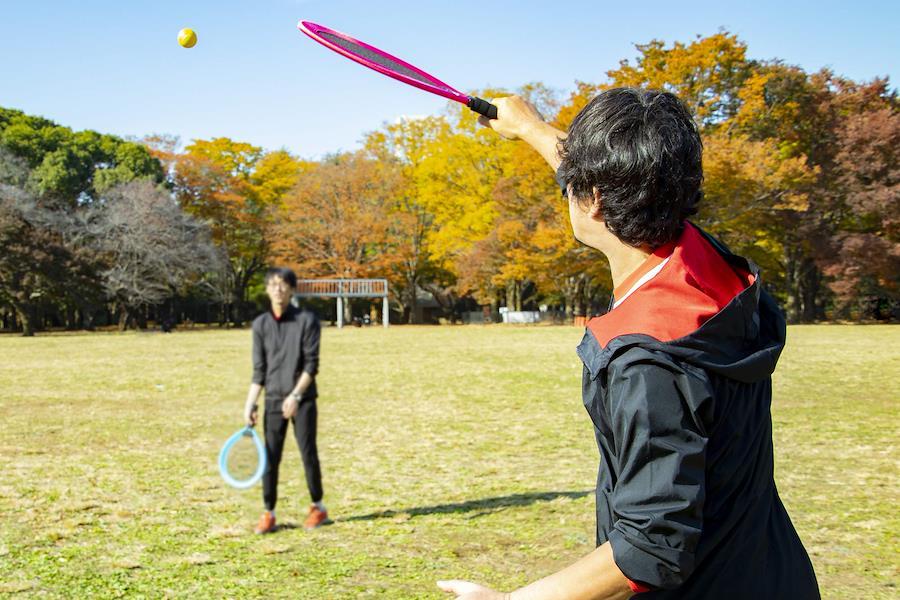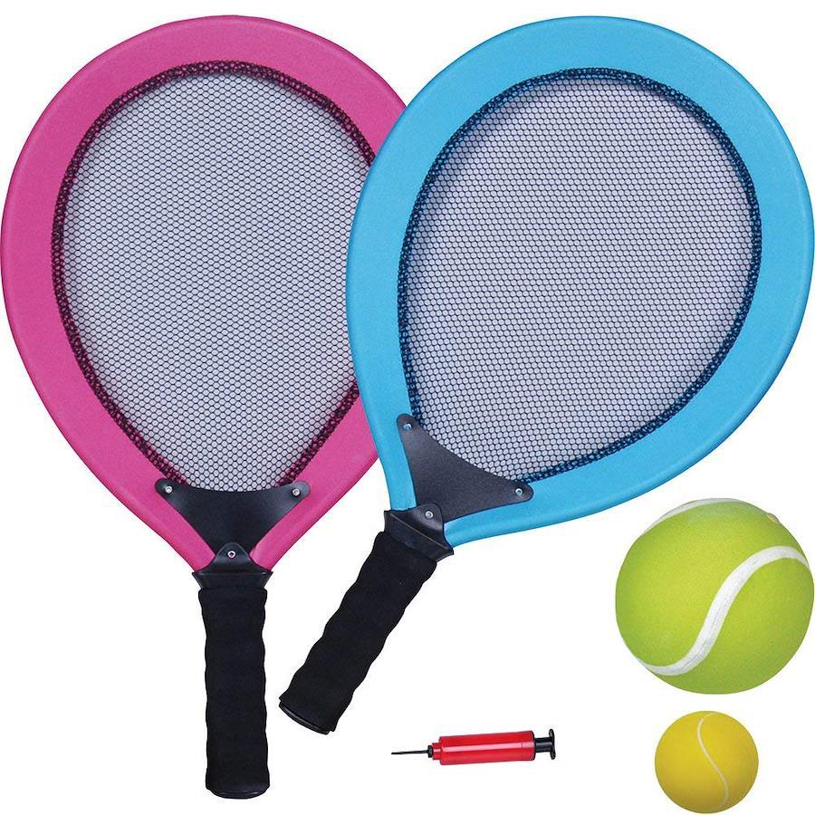 ●インパクトの抜群のデカテニスセット●大きくて打ちやすく、跳ねる!※周囲の安全を確認の上、ご使用ください。※直射日光があたる場所、高温多湿な場所には保管しないでください。※小さなお子様が口に含めないよう必ず手の届かない場所に保管してください。 セット内容:ラケットx2個・テニスボールx2種 セット重量:約450g 対象年齢:6歳以上 ラケットサイズ:約300x550x25mm ラケット重量:約170g ボールサイズ:大/約φ130mm 小/約φ63mm 屋外用 材質:ラケット/ポリエステル・ポリ塩化ビニル、ABS樹脂・ポリプロピレン・合成ゴム テニスボール小/ポリウレタン テニスボール大/ポリエステル・ポリ塩化ビニル ポンプ/ポリプロピレン