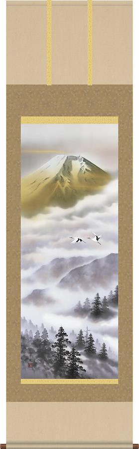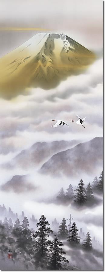 霊峰富士は古くから山岳信仰の極み山水画掛け軸で穏やかな空間を創造する!一幅の掛軸が床の間を演出いたします!遥かにたなびく雲海から聳え立つ霊山の最高峰に鶴が悠々と飛翔する。私たちの心の拠り所として君臨する雄姿を熟練の筆さばきで丹念に描き上げた精神性の高い一品。