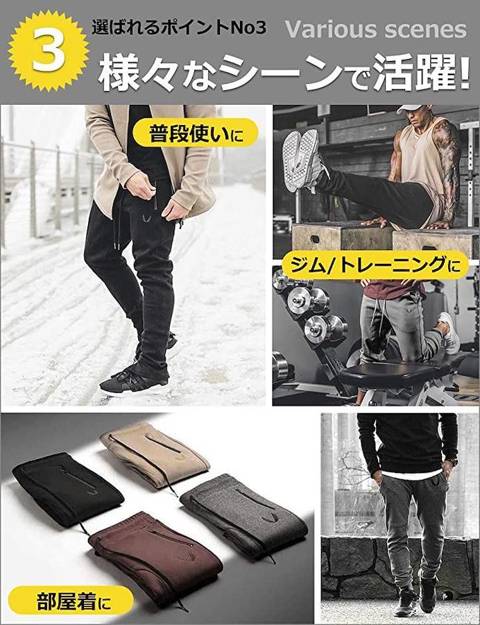 タイトな細身ラインなので、足がすらりと長く見え脚長効果抜群。 鍛え上げた筋肉を見せつけるのにも* すそに向かって細くなっているジョガータイプなので、足元周りがダボつかずトレーニングに集中出来ます。