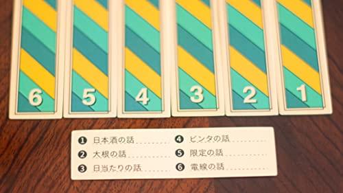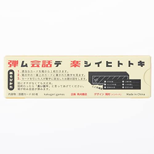 遊び方は 1.適当なカードを箱から1枚引く 2.箱の中の一番上のカードに書かれた数字を見る 3.数字に該当したお題の話をする 話にオチがなくても大丈夫。 話終わったら「良い話や」とみんなで言ってあげ てください。 場が和み会話が弾みます。 弾ム会話デ楽シイヒトトキ オチがなくても大丈夫!終わったら「良い話や」が唯一のルール ここでしか聞けない話が出ることも ガムサイズで持ち運びに便利