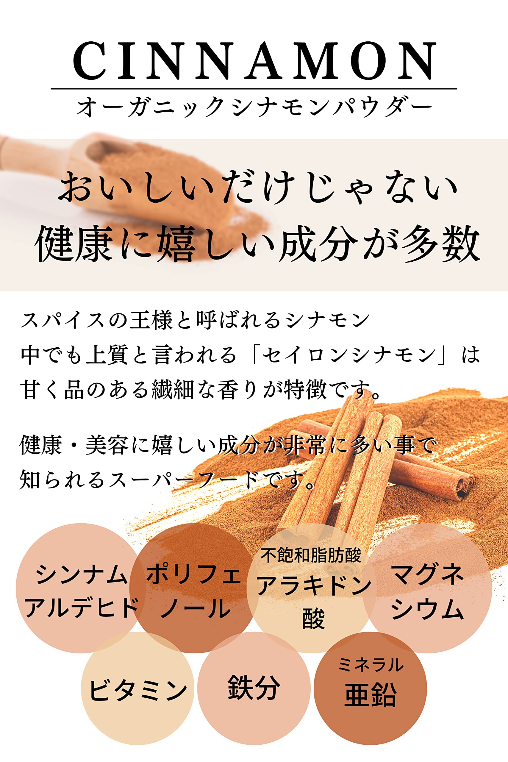 ?【安心の有機JAS認定!】オーガニック栽培されたスリランカ産のシナモンを使用しています。無農薬・無化学肥料で栽培されているので、スパイスなどに安心してお使いいただけます。国内工場にて異物除去・袋詰めを行っているので、衛生面も安心。シナモンパウダー、シナモンスティックをそれぞれご用意。用途に合わせてご利用ください!?【摂取量を気にせずお使いいただけます!】シナモンには「セイロン」と「カシア」の2種類があるってご存知ですか?セイロンはカシアに比べ「クマリン」と言う成分がほとんど含まれていないので、「シナモンをたくさん使いたい…」「だけどクマリンの摂取量が気になる…」そんな方には摂取量を気にせず使えるセイロンシナモンがオススメです!?【甘く上品な香りがアクセントに!】繊細で上品な香りをお楽しみいただけるセイロンシナモン。シナモンロール、シナモンシュガーパイ、パウンドケーキ、シナモンライス、シナモンティー、ロイヤルミルクティー、コーヒーなど、シナモンスティックを加えていただくだけで風味がぐっと豊かになります。カシアに比べると、上品で香り高い味わいのセイロンシナモン。様々なお菓子やドリンクとともに、贅沢なその香りを是非お楽しみください。?【食べる美容「セイロンシナモン」】セイロンシナモンは実はスーパーフードと呼ばれるほど、多くの栄養素が含まれています。鉄分、ビタミン、カルシウム、カリウム、マグネシウム、ナイアシンなどなど。多くの栄養素を美味しく摂取できるシナモンスティックです。有機JAS認定を受けているシナモンスティックなので、お子様からお年寄りの方まで、ご家族皆さまで安心してお召し上がりいただけます!?【古くから愛されてきた「スパイスの王様」シナモン】シナモンはスパイスの王様と言われるほど、その甘美な香りが古くから多くの人々を魅了し、古くから愛されてきた歴史があります。香りはもちろんのこと、漢方では桂皮という生薬で親しまれています。漢方でもおなじみのシナモンスティックが、体のポカポカをサポートします。【重要】メーカーによる商品リニューアルに伴いパッケージ(内容量も含む)変更が行われた場合、新パッケージでお届け致します事ご了承願います。