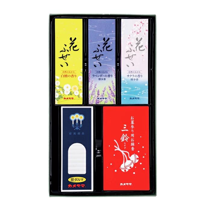 花ふぜい 黄 白檀、花ふぜい ラベンダー 煙少香、花ふぜい 桜 煙少香各約30g、三鈴香約40g、カメヤマ小ローソク豆ダルマ(30本入)×各1
