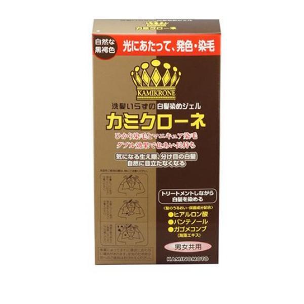 製品の特徴●加美乃素「カミクローネ」は、洗い流し不要のジェルタイプの白髪用ヘアマニキュアです。●ヘアマニキュアに光で染まる成分をプラスし、ダブルの効果で色合い長持ち。●カミクローネは酸性タイプの染毛料。ヒアルロン酸をはじめとする毛髪保護成分がうるおいとなめらかさを与え、美しいつややかな髪に仕上げます。●気になる、生え際・分け目もカミクローネならしっかりと染め上げます。●塗布後3~5分のブラッシングでマニキュアが浸透・定着し染毛完了。髪が乾けば色移りしません。●ヒアルロン酸・パンテノール・海藻(カゴメコンブ)配合。●付属品:全体用ブラシ、細部用コーム、塗布用手袋、ケープ●販売名:カミクローネ(DB)