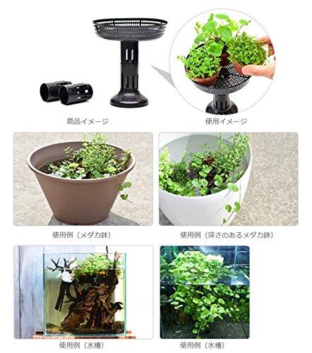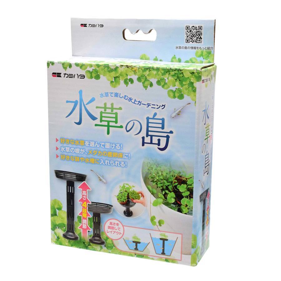 「水草の島」は、網目状のプレートに好きな水草を置き、高さを調節して水面近くに設置することができます。水面近くで育成すると、水中だけでなく、空中へも立体的に水草が成長し、ビオトープやテラリウムの雰囲気を創ることができます。プレートに水草を置き、高さを調節するだけですが、いろいろな種類の水草を組み合わせるなど、工夫次第で様々なレイアウトを楽しむことができます。見慣れたいつものメダカ鉢を、「水草の島」で新しい雰囲気に変えてみませんか。