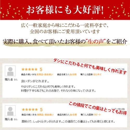 通常1-5営業日で発送「高級本枯節」の熟成かつお節を厚く削った商品です。 和食はもとよりお蕎麦のだしや煮物、ラーメンの隠し味として料理の味に個性を持たせるそんな商品となっております。 現在、九州内、関東関西方面の販売では行列の出来る有名店様等でもご指示を頂いております。 満足のいくお出汁がとれるでしょう。 ワンランクもツーランクも上のお料理でみんなの笑顔も満開です♪ ※業務用商品をさらに、まとまった数量でご注文頂ける場合は、別途見積りいたしますのでお問合せください。(毎月50袋以上定期購入の場合) TEL 0993-35-2323 e-mail [email protected]