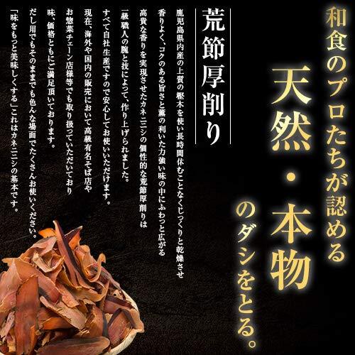 【農林水産大臣賞受賞】本枯節生産1位の鹿児島県指宿市山川にて80年以上の鰹節製造の歴史がある老舗「カネニニシ」の公式ショップ。 通常は業務用のみの鰹節を特別に一般販売しています。【伝統技術で旨味を凝縮した鰹節】多数の人気飲食店でご愛用いただいている鰹節は熟練職人が伝統技術を向上させながら、国内の工場で生産しています。 荒節は長期燻製熟成方式で約2週間~一ヶ月という長期間にかけて鰹を燻製と乾燥を繰り返し内部の水分をしっかり飛ばして旨味を閉じ込めます。燻製の際には木材も国産を使用しています。【化学調味料不使用】カネニニシの鰹節は化学調味料は使用せず、天然素材だけで製造しています。自然の旨味が豊かな鰹節はお子様にも安心して召し上がっていただけます。【鰹節は栄養が豊富】一般的に鰹節には生きていくうえで欠かせない必須アミノ酸やEPA、DHAやビタミンが含まれています。鰹節は削り節や粉末になるとお料理にふりかけるだけで摂取できるので毎日食べるのがおすすめです。【厚削り加工】 長時間煮込むことでお店のようなしっかりした出汁が取れます。 おそばのつゆにおすすめです。 そのままでもおつまみやおやつとして食べられます。 出汁で美味しい鰹節はそのままでも美味しいです。原材料:かつおのふし/生産地:鹿児島県山川産 賞味期限:製造から11カ月/内容量:1kg 包装形態:不活性ガス充填 気密容器入【重要】メーカーによる商品リニューアルに伴いパッケージ(内容量も含む)変更が行われた場合、新パッケージでお届け致します事ご了承願います。