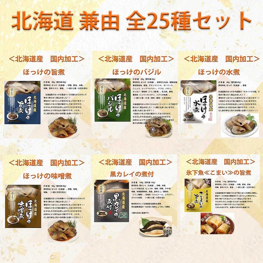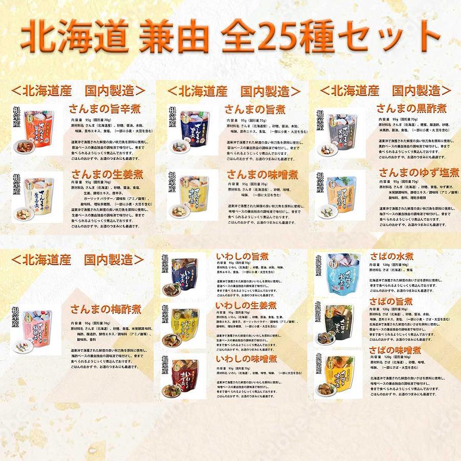 【内容】さんまの旨煮 さんまの味噌煮 さんまの生姜煮 さんまの旨辛煮 さんまの黒酢煮 さんまのゆず塩煮 さんまの梅酢煮 いわしの旨煮 いわしの味噌煮 いわしの生姜煮 ほたての旨煮 ほたての水煮 ほたてバター醤油 ほたてのバジル さばの旨煮 さばの味噌煮 さばの水煮 ほっけの旨煮 ほっけの味噌煮 ほっけの水煮 ほっけのバジル こまいの旨煮 黒カレイの煮付 まるあなご蒲焼き風 まる煮あなご