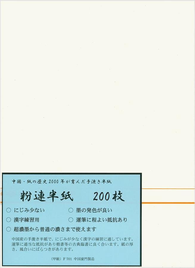 【漢字用半紙 粉連半紙 (甲級)200枚 中国廈門製造】 中国産の手漉半紙。ニジミが少なく漢字・細字の練習用に適しています。運筆に程よい抵抗があり楷書等の古典臨書に良く合います。初心者から中上級者まで使えます。半紙の厚さ、風合いにばらつきがあります。 ・商品サイズ:245×335㎜ 200枚入