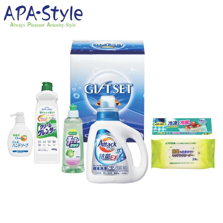 花王アタック抗菌EX880g、ライオンチャーミーグリーン260ml、ライオンリード冷凍も冷蔵も新鮮保存バッグS3枚、クリームクレンザー400g、オレンジジェルハンドソープ200ml、除菌キッチンクリーナー24枚×各1
