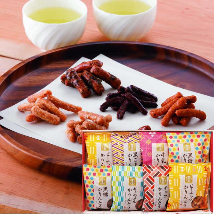 黒糖かりんとう、ピーナツかりんとう各45g×2、黒ごまかりんとう、牛乳かりんとう、チョコかりんとう、キャラメルかりんとう各45g×1