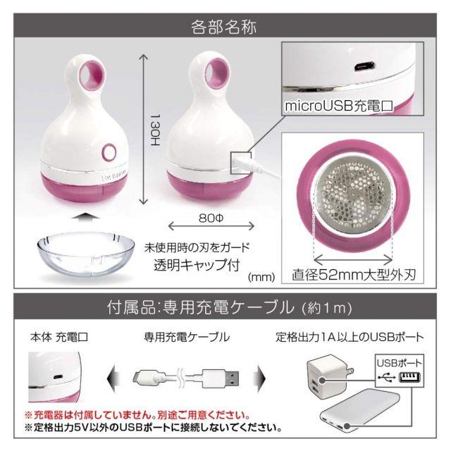 コードレスで使えるUSB充電式の毛玉取り器です。充電満タン時に連続で最大1時間使用できます。専用USB充電ケーブル(約1m)が付属。※充電器は付属していません