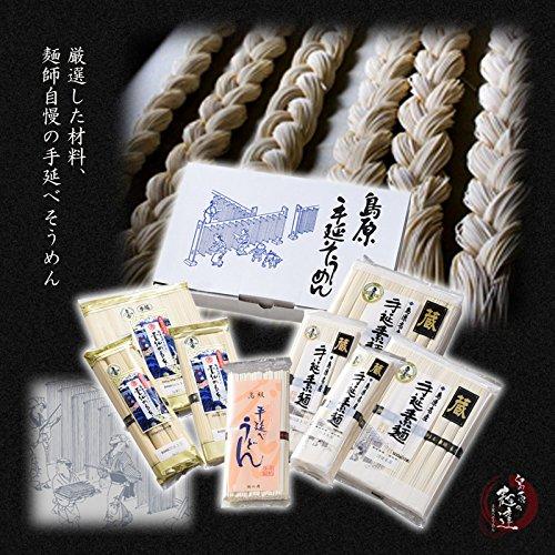 雄大な自然に育まれ島原手延素麺は独自の進化をとげました。伝統の技、島原手延素麺に現代の品質管理を加え完成しました。原料の小麦粉は強力粉を使用しているため少しあめ色かかった色が特徴です。塩はミネラル豊富な長崎県崎戸産天然塩を使用しております。延びにくいのでそうめんチャンプルにしたり温めんにしたりとお料理の幅が広がります。