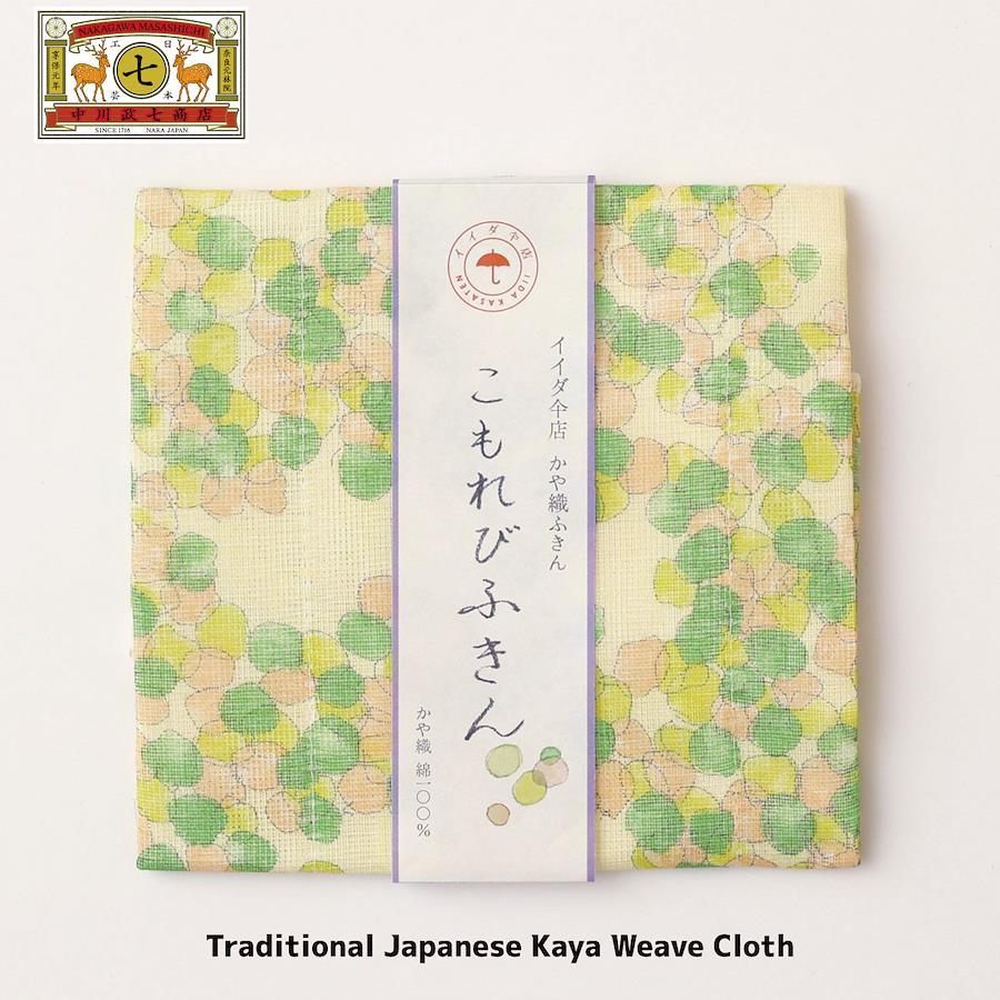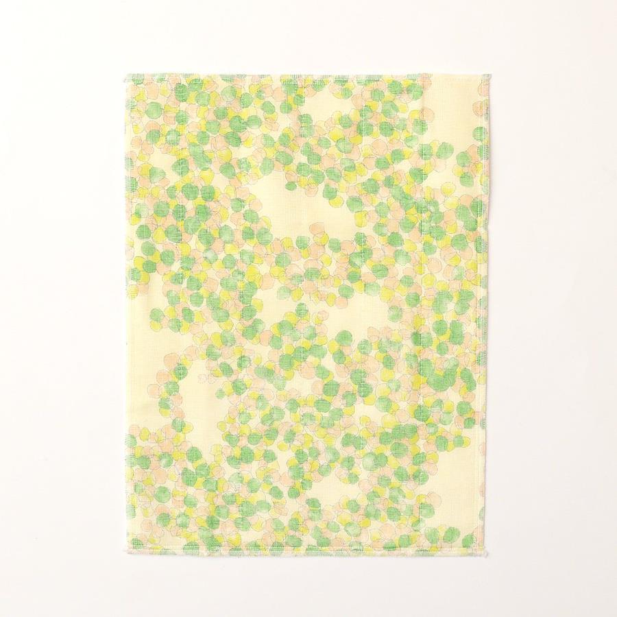 木々の間から差し込む太陽の光と、風に揺れる葉のやわらかな動きをデザインに映したかや織ふきん。