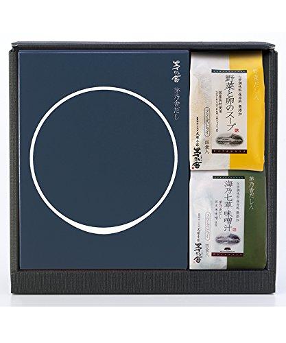 内容量:贈答用 茅乃舎だし(8g×22袋入)・野菜と卵のスープ(8.2g×4袋)・海乃七草味噌汁(10.9g×4袋) 茅乃舎だし(8g×22袋入) 四種のだし素材をバランスよく配合。何にでも幅広く使えます。 内容量:8g×22袋 野菜と卵のスープ ほうれん草に卵という王道の組み合わせ。5つの素材を合わせた「野菜だし」を使ったうまみのある洋風スープは、忙しい朝にもお薦めです。フリーズドライなので、熱湯を注ぐだけ。 内容量:32.8g(8.2g×4袋)入 海乃七草味噌汁(4食入) 茅乃舎だし」を使い、化学調味料・保存料無添加で仕上げたフリーズドライの味噌汁。海の七草(とろろ昆布、わかめ、ふのり、のり、ひとえぐさ、めかぶ、もずく)を米味噌で仕上げました。 内容量:43.6g(10.9g×4袋)入【重要】メーカーによる商品リニューアルに伴いパッケージ(内容量も含む)変更が行われた場合、新パッケージでお届け致します事ご了承願います。