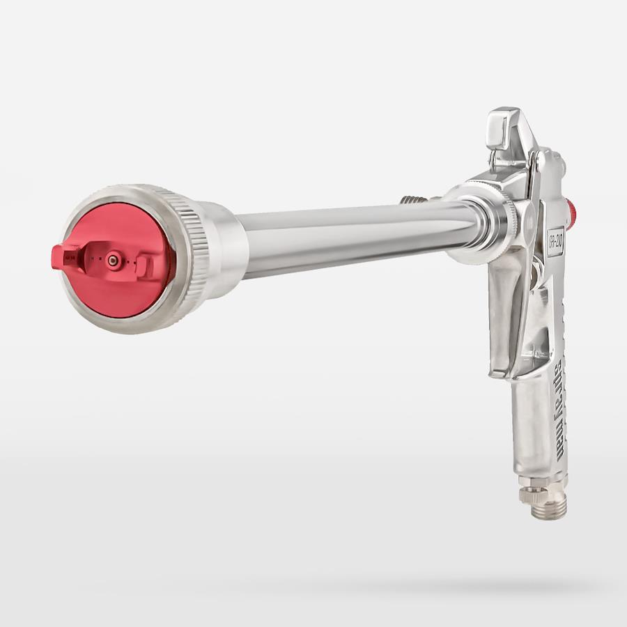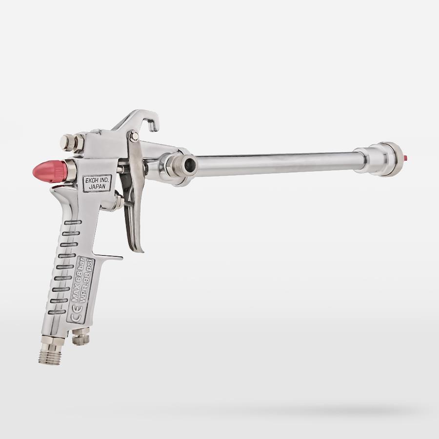 恵宏製作所 GR-210Lはロングノズルの先端までニードルがあり、首が長いにもかかわらず、そのノズルから放たれる霧は均一で大変に細かく、高微粒化できます。200mmのロングノズルを採用しました。室内の施工では、壁面はもちろん天井の施工もあります。室内の天井高は一般的に2500mm前後なので、身長170cmの施工者が通常のスプレーガンを使って施工する場合は脚立を使う必要があります。200mmロングノズルの恵宏製作所 GR-210L なら、壁の高い位置や天井でも、脚立の必要はありません。通常の姿勢での施工が可能です。