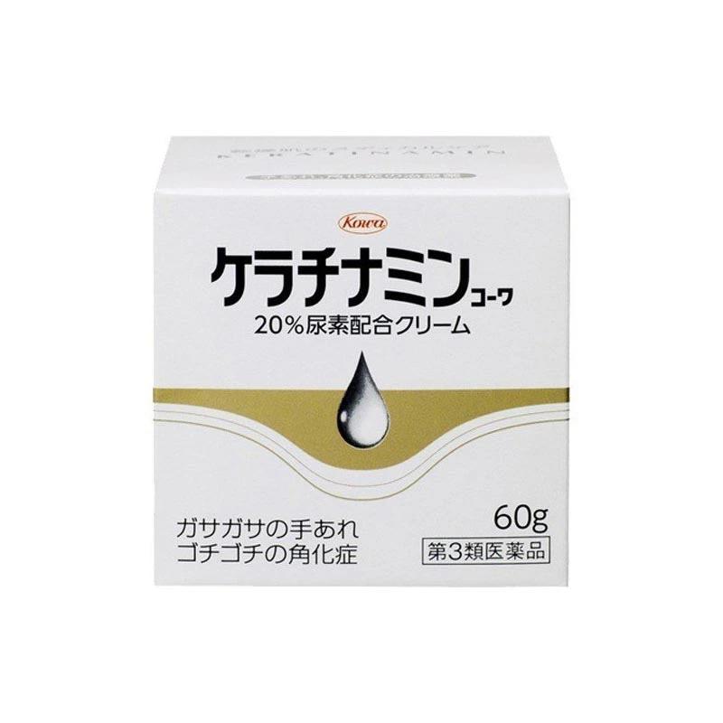 【ケラチナミンコーワ 20%尿素配合クリームの商品詳細】●水仕事などで手がカサカサする。●かかとが硬くコチコチになる。●ひじ、ひざ、くるぶしが黒ずんでザラザラする。●これらは、皮膚が乾燥する時期に特に多い症状です。こうした症状が続きますと、皮膚のガサつき(ドライスキン)が更にひどくなったり、角質層が厚くなったりして、症状が悪化する場合があります。●本剤は、こうした症状を効果的に治療するために、すぐれたドライスキン改善作用をもつ尿素20%をOTC医薬品として初めて処方したお薬です。●お使いになりますと、20%尿素が働いて、体の中にある水分を皮膚の角質層に効率よくとり込み、皮膚表面から水分が飛ばないようにしてくれますので、「皮膚をみずみずしくさせる効果」があります。しかも、「皮膚をなめらかにする効果」があいまって、皮膚を正常な状態に治してくれます。【効能 効果】手指のあれ、ひじ・ひざ・かかと・くるぶしの角化症、老人の乾皮症、さめ肌【用法 用量】1日数回適量を患部に塗擦してください。(用法・用量に関連する注意)(1)用法・用量を守ってください。(2)目に入らないように注意してください。万一、目に入った場合には、すぐに水又はぬるま湯で洗ってください。なお、症状が重い場合には、眼科医の診療を受けてください。(3)小児(15歳未満)には使用させないでください。(4)外用にのみ使用してください。(5)化粧品ではありませんので、効能・効果で定められた患部のみに使用し、基礎化粧等の目的で顔面には使用しないでください。【お問い合わせ先】本製品に関するお問い合わせは、お買い求めのお店又は興和株式会社 医薬事業部 お客様相談室センターへお願いします。103-8433 東京都中央区日本橋本町三丁目4-14TEL 03-3279-7755FAX 03-3279-7566電話受付時間:月-金(祝日を除く)9:00-17:00製造販売元興和株式会社東京都中央区日本橋本町三丁目4-14【成分】100g中尿素:20.0g (体内の水分を皮膚に取りこんで、皮膚をしっとりなめらかにします。)添加物:ワセリン、流動パラフィン、セタノール、ステアリルアルコール、ポリソルベート60、ステアリン酸ソルビタン、ポリオキシエチレン硬化ヒマシ油、グリシン【注意事項】★使用上の注意・してはいけないこと(守らないと現在の症状が悪化したり、副作用が起こりやすくなります)次の部位には使用しないでください(1)目のまわり、粘膜等。(2)引っかき傷等のきずぐち、亀裂(ひび割れ)部位。(3)かさぶたの様に皮膚がはがれているところ。(4)炎症部位(ただれ・赤くはれているところ)。・相談すること1.次の人は使用前に医師、薬剤師又は登録販売者に相談してください(1)医師の治療を受けている人。(2)薬などによりアレルギー症状を起こしたことがある人。2.使用後、次の症状があらわれた場合は副作用の可能性がありますので、直ちに使用を中止し、この添付文書を持って医師、薬剤師又は登録販売者に相談してください(関係部位:症状)皮膚:発疹・発赤、かゆみ、刺激感(いたみ、熱感、ぴりぴり感)、かさぶたの様に皮膚がはがれる状態3.2週間使用しても症状がよくならない場合は使用を中止し、この添付文書を持って医師、薬剤師又は登録販売者に相談してください★保管および取扱い上の注意(1)本剤のついた手で、目など粘膜に触れないでください。(2)高温をさけ、直射日光の当たらない湿気の少ない涼しい所に密栓して保管してください。(3)小児の手の届かない所に保管してください。(4)他の容器に入れ替えないでください。(誤用の原因になったり品質が変わります。)(5)使用期限(外箱及び容器に記載)をすぎた製品は使用しないでください。【原産国】日本