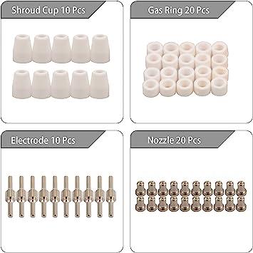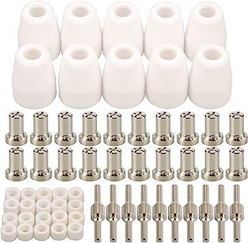 プラズマ切断消耗品 60個。パッケージ内容:ニッケルメッキプラズマチップノズル20個拡張参照番号:18866L。ニッケルめっき電極10個 - 拡張参照番号:18205L。シュラウドセラミックカップ10個。参照番号:18204。20個 ガスリング No:18785PT-31 JG-40とWSD-40のカッティングトーチにフィット。高周波プラズマ切断機下で40 50A電流の使用に適した切断トーチ、12mmの鉄を切断します。Machine のブランドはRilon、Riland、Jasic、M