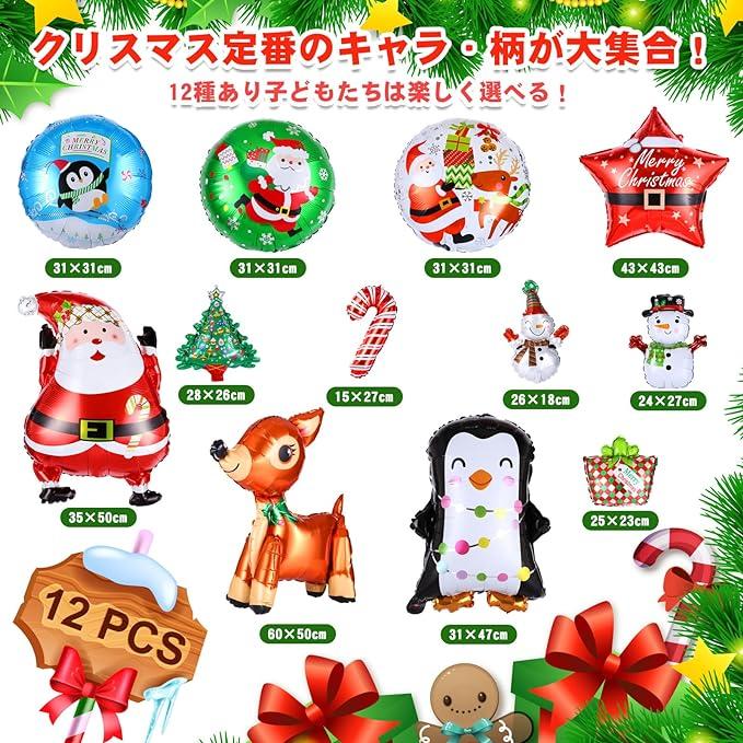 ■商品説明【たっぷり12種セット】入数:バルーン×12個、付属品:紐、サイズ:膨らまし後W24~60㎝×H18×50㎝、小さいサイズから大きいサイズまで豊富なサイズバリエーションがあるクリスマス風船セットでクリスマスの気分をより盛り上げよう~☆ 【クリスマスポップ】サンタ、ツリー、ペンギン、星などクリスマス定番のデザインが大集合したアルミ風船、膨らんで可愛く立体感あり見栄えよく、クリスマスディスプレイとしてはピッタリ!クリスマスムードで満たせます。 【ふわ?っと浮かせるバルーン】水素・ヘリウムガスを入れて浮かせます♪お部屋・リビングやお店などの壁面装飾に丁度いい、装飾したら手軽にクリスマス空間が作ります! 【盛り上がるグッズ】クリスマスパーティー・イベント・祭りなどでの飾り付けに華やかさをプラスします~クリスマスカーテンやガーランド、電飾どの装飾を組み合わせるとポップに変えて映えてフォトスペースが出来上がります。 【色んな場面で活躍】オシャレでクリスマスらしい柄多種多様が入ってるので、クリスマスプレゼントとして子どもに贈ったらキット大喜ばせることは間違いなし!クリスマス景品や販促用のお配りギフト・贈り物としてもおすすめ~クリスマスをより楽しんでくれます。?もっと見る