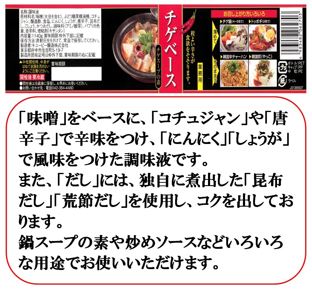 お客様の多様なニーズにお応えして、開発された“業務用チゲベース"は、使い勝手がよく、業務用で人気の商品です。実際に居酒屋や、焼肉屋さん等でも多く使われています。「味噌」をベースに、「コチュジャン」や「唐辛子」で辛味をつけ、「にんにく」「しょうが」で風味をつけました。「だし」には、独自に煮出した「昆布だし」「荒節だし」を使用し、コクを出しております。ただ辛いだけではない、旨味とコクを感じるチゲベースです。製造元は、キユーピー株式会社のグループ会社「キユーピー醸造株式会社」。キユーピーマヨネーズのお酢を製造している会社です。このチゲベースは、店頭ではほとんど販売されていない、業務用商品です。チゲ鍋スープの素や、炒めソース、漬け込みソースなど、いろいろな用途でお使いいただけます。【炒飯・冷奴】そのまま原液で、1人分大さじ1杯分くらいを目安に使用してください。【チゲ鍋】4-5倍で希釈するため本品1本(内容量1140g)で8~9食分のチゲなべが完成します。※700gで3-4人前分だとした場合※お好みに応じて加減してください。本格的なプロの味を、簡単にご家庭でお楽しみください!