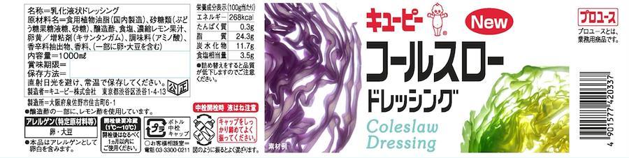 名称:乳化液状ドレッシング 原材料:食用植物油脂、醸造酢、砂糖等(ぶどう等果糖液糖、砂糖)、食塩、レモン果汁、オニオンエキス、調味料(アミノ酸)、増粘剤(キサンタンガム、加工でん粉)、卵黄、香料、香辛料抽出物、(原材料の一部に大豆を含む) 栄養成分表示:100g当たり エネルギー 510kcal、たんぱく質 0.3g、脂質 51.6g、炭水化物 10.6g、ナトリウム 1.3g
