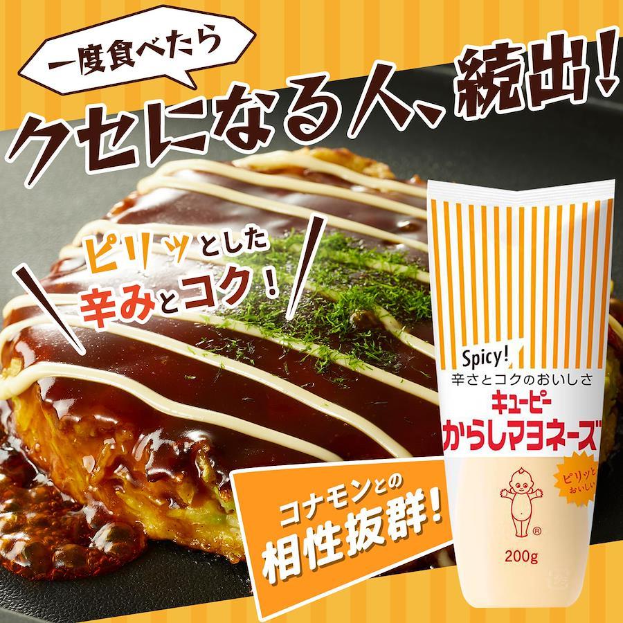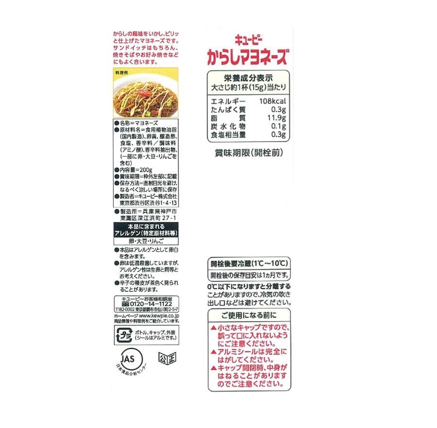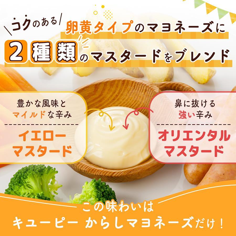 卵は卵黄のみを使用し、コクのある“キユーピー マヨネーズ"をベースに、からしの風味をいかし、ピリッと仕上げたマヨネーズです。サンドイッチ、ホットドッグなどのパン料理や、焼きそば、お好み焼きにも良く合います。絞り出し口が細口にも星形にもできる、ダブルキャップです。