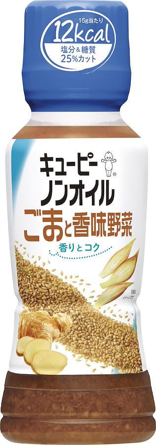 塩味控えめ ノンオイル ごまと香味野菜 しょうが、みょうがなどの香味野菜を使用し、風味豊かに仕上げました。(15g あたり12kcal、食塩相当量0.8g) ゆで豚や豆腐のサラダによく合います。 すっきりとしたコクとうま味がある、油を使わないドレッシングタイプ調味料です。 塩味を控えめにし、素材の風味がより感じられるようにしました。 ※塩味控えめについて:「食品成分表2015 和風ドレッシングタイプ調味料」と比較して、各商品の分析値一例が食塩相当量を25%以上カットしていることから、「塩味控えめ」と表記しています。