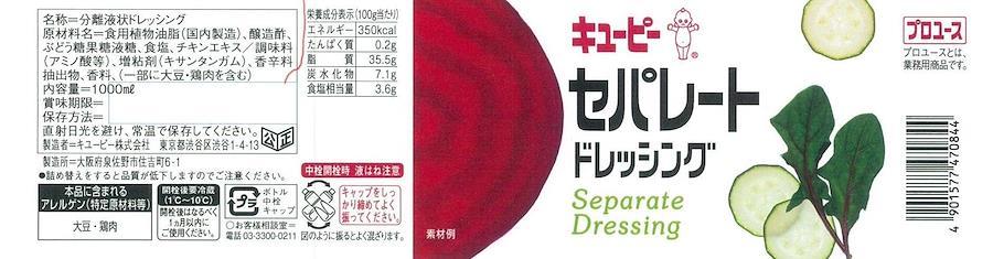 原材料:食用植物油脂、醸造酢、ぶどう糖果糖液糖、食塩、調味料(アミノ酸等)、増粘剤(キサンタンガム)、香辛料抽出物、チキンエキス、香料、(原材料の一部に大豆を含む)