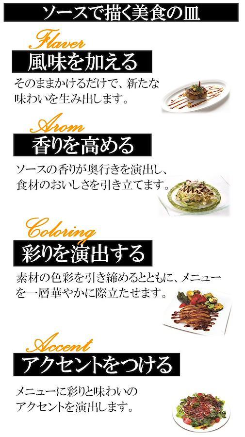 スモーク風味豊かなスパイシーで濃厚な業務用の本格ソースです。線描きしやすいボトルと粘度になっておりますので、おしゃれに線描きしてスタイリッシュにメニューを演出することができます。そのまま肉料理やホットドッグ、野菜などにかけて召しあがってください。簡単にスモークの香りのメニューになります。