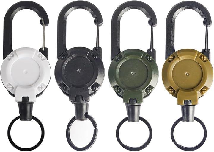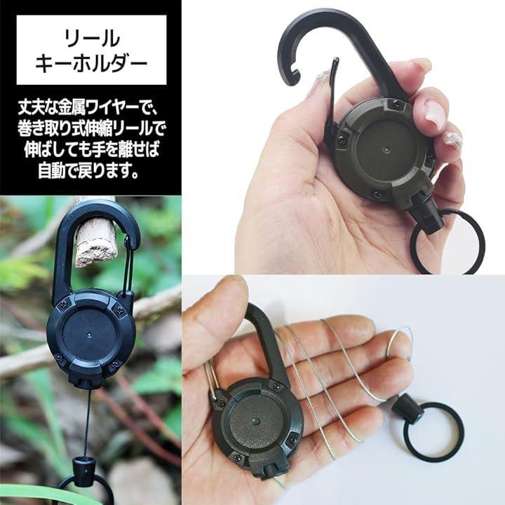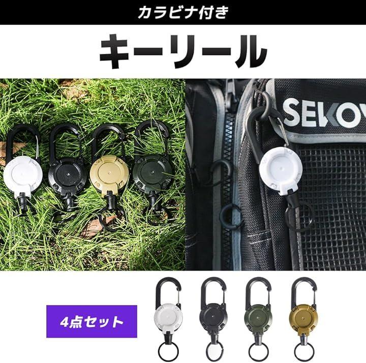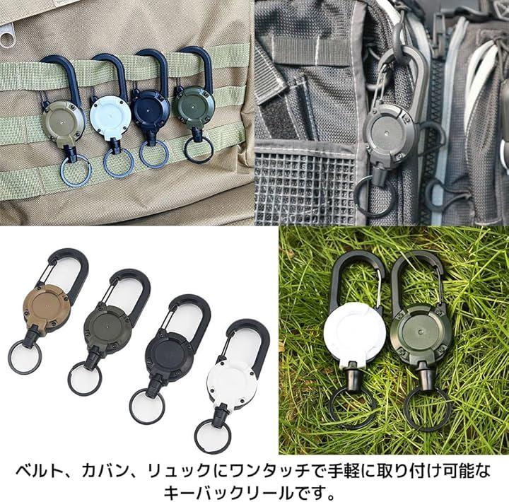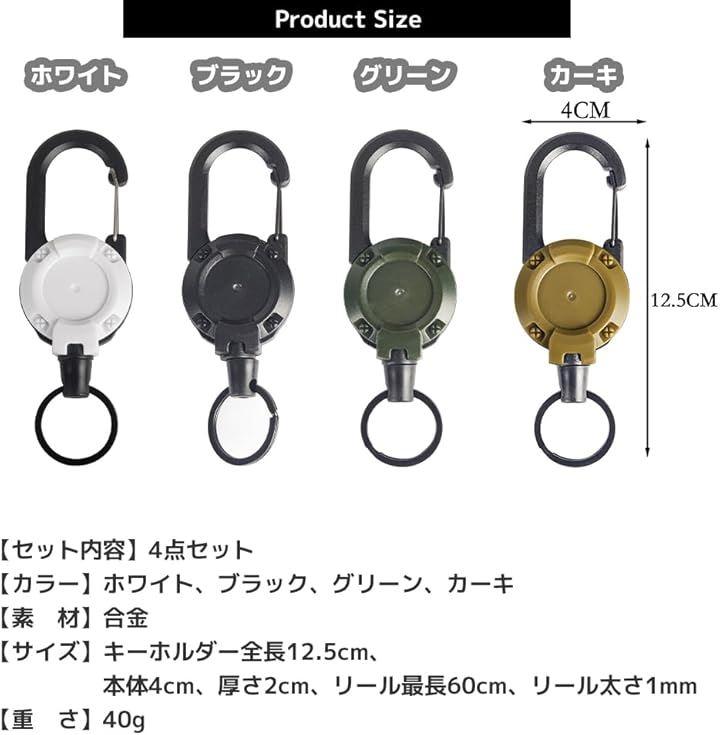 「セット内容」4点セット「カラー」ホワイト、ブラック、グリーン、カーキ「素材」合金「サイズ」キーホルダー全長12.5cm、本体4cm、厚さ2cm、リール最長60cm、リール太さ1mm「重さ」40g