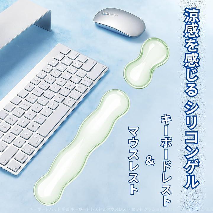 「ひんやり快適キーボード&マウスリストレストセット」 長時間のPC作業による手首の負担を軽減する、機能的なキーボードレストとマウスレストのセットです。