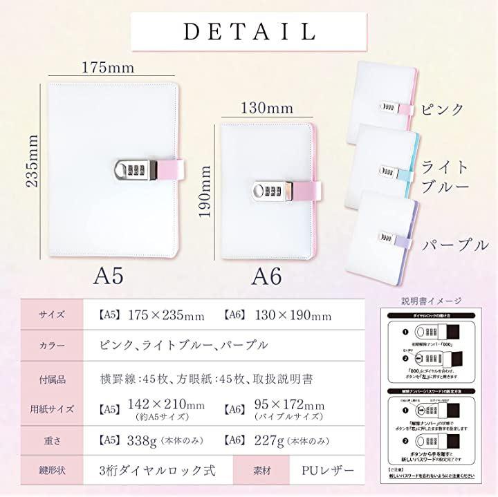 「素材」高品質PUレザー「付属品」横罫線:45枚、方眼紙:45枚、合計90枚(180ページ分)「付属用紙サイズ」A5タイプ:142x210mm(約A5用紙サイズ)。