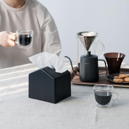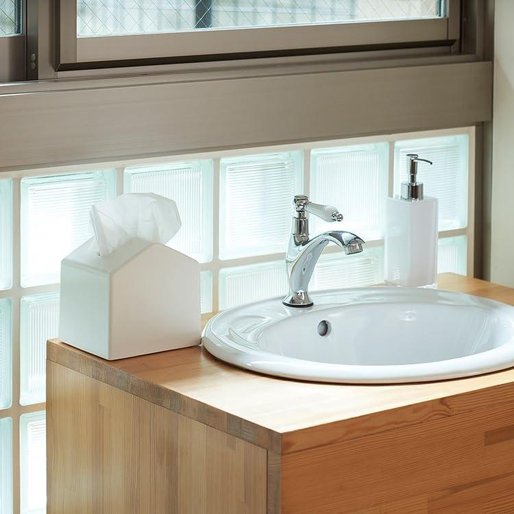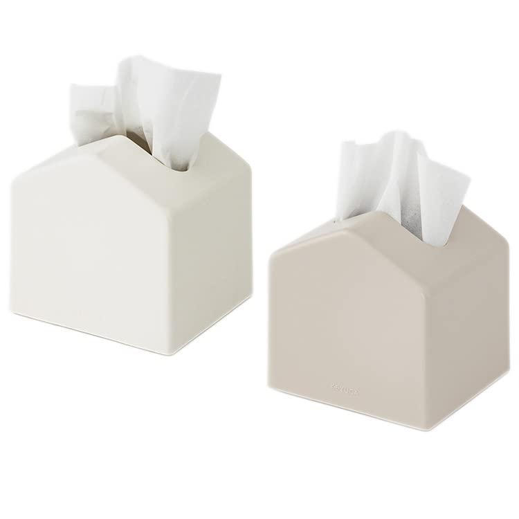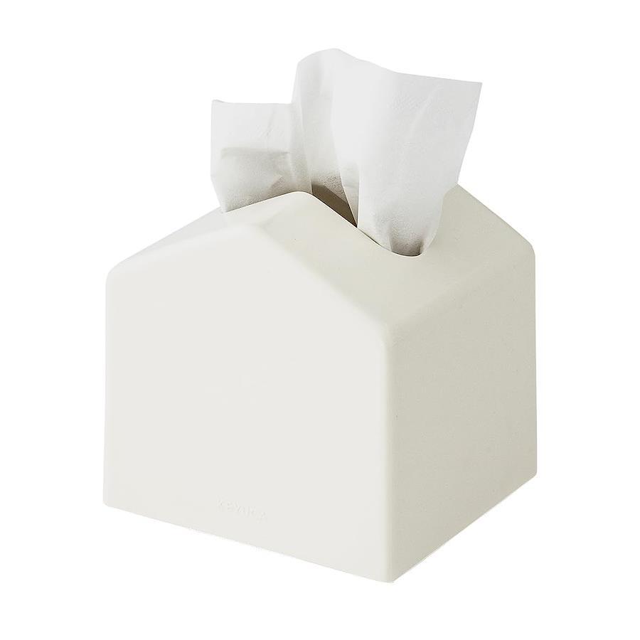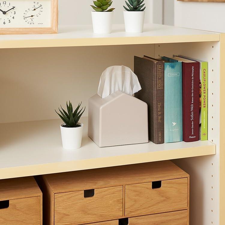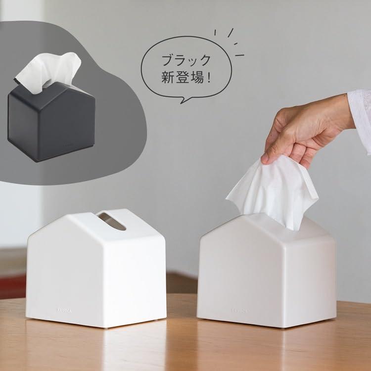 【ボックスの容量がそのまま収まる、省スペースでかわいい。】詰め替えタイプのティッシュケース。 一般的なサイズ(厚み約40~50mm程度)のティッシュボックスやソフトパックタイプの容量がそのまま収まります。 本体は「おうち」の様な形で見た目もかわいく、ティッシュボックスをそのまま置くには抵抗のあるリビングやダイニングなどにもピッタリです。 約14×12.4×14cmとコンパクトで場所を取らないので、スペースに余裕のないデスク周りや棚中にもスッキリ収まります。 樹脂製なので汚れに強く、お手入れも楽々。 洗面所やキッチンなどの水回りでもお使い頂けます。 【コンパクトで詰め替え簡単!秘密はオリジナル構造】 ティッシュペーパーを箱から出し、二つ折りにして乗せ、上から本体を被せるだけ。 力をかけなくてもカチッと固定。分かりやすい動作で簡単に詰め替えが出来るように工夫しました。 ティッシュを束ごと折り曲げてケースに収納することで、ティッシュの容量はそのままに設置床面積を大幅カット。スペースを有効活用することができます。 また、枚数が減ってきても取り出しやすく、最後の一枚までスルスルッと使い切ることができます。 シンプルなだけじゃない、使いやすさにこだわったKEYUCAのオリジナル設計です。 ※特許7257717号 ※意匠登録第1720079号 ※別途知的財産権出願中 【商品詳細】サイズ:約W14×D12.4×H14cm/重量=約360g/材質:ABS樹脂/生産国:ベトナム