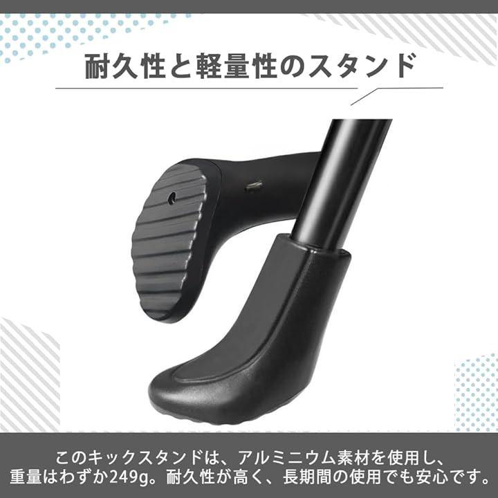 「耐久性と軽量性のスタンド」このキックスタンドは、アルミニウム素材を使用し、重量はわずか249g。