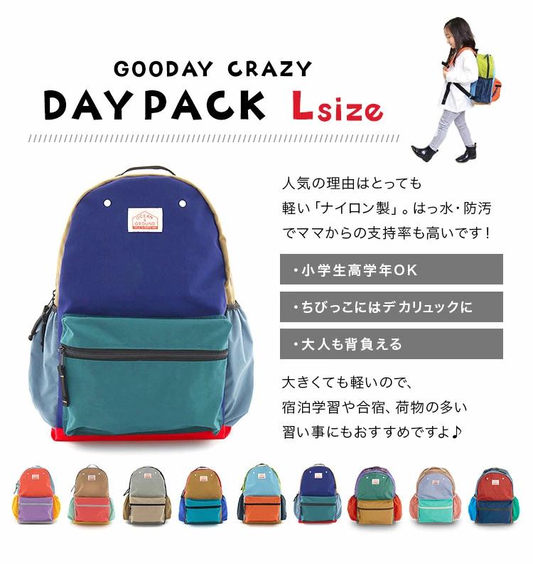 【デイパック CRAZY MORE】小学校の高学年から、大人まで幅広い年代の方に◎たっぷり入る大容量のOCEAN&GROUNDの定番デイパック Lサイズ。開閉しやすいYKKファスナーを使用し、広いマチに全面とサイドにもポケットが2つありペットボトルもすっぽり入ります。高学年の子から大人まで使えるサイズ感で幅広い年代にオススメです。