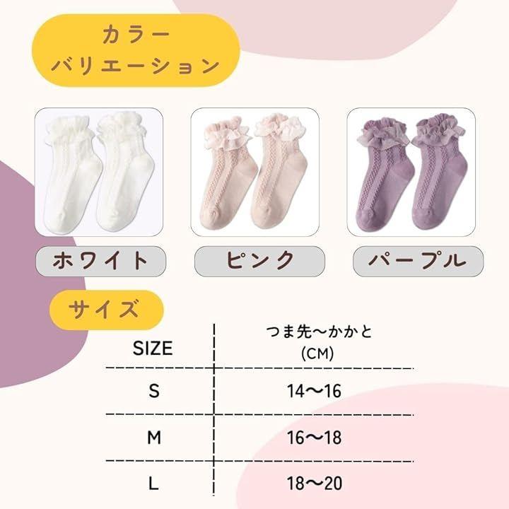 可愛らしい女の子のために、選べる3つのカラー(白、ピンク、パープル)が揃ったフリルソックスをご紹介します。サイズもSサイズ(14cm~16cm)、Mサイズ(16cm~18cm)、Lサイズ(18cm~20cm)からお選びいただけます。