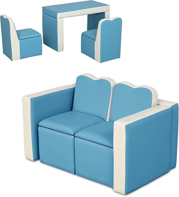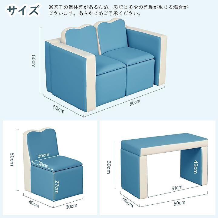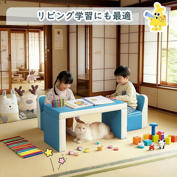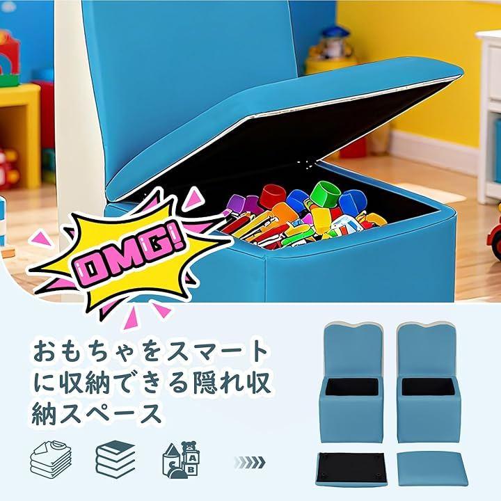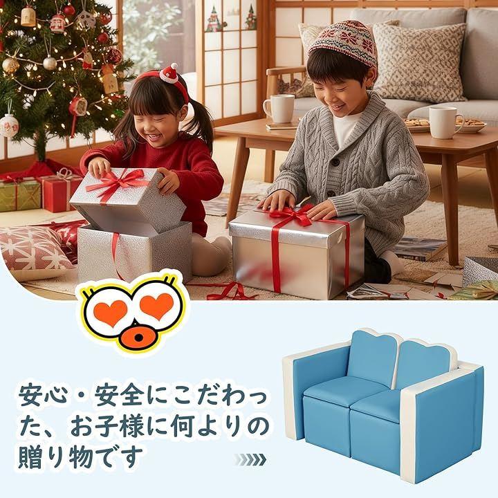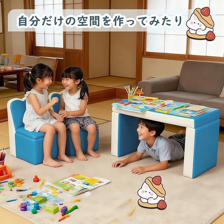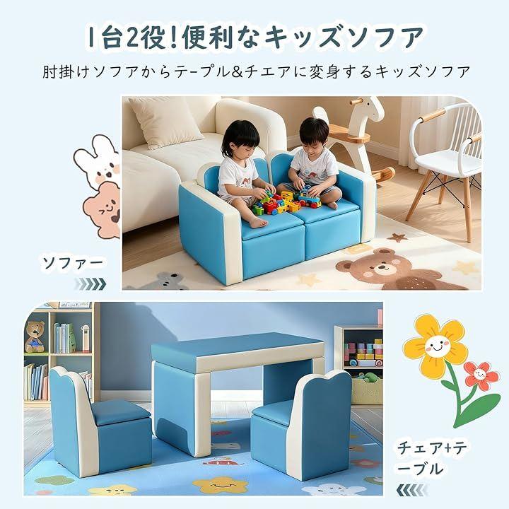 組み合わせればお子様用のソフアに、2 つに分ければ机と椅子になる 2 通りの使い方ができます。