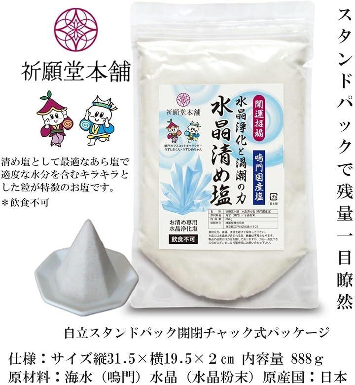 水晶と大ウズシオがシンボルのパッケージは湿気を防ぎ何度使用しても、開閉しやすいチャック式で、保管しやすく残量が一目で分かる自立式、 透明スタンドパックを採用した「祈願堂 本舗」ブランドが誇る浄化、お清めの塩です。