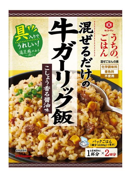 温かいごはんに混ぜるだけ。 炊き込む必要がなく、炊いたごはんにまぜるだけで、簡単に手づくり感のある混ぜごはんができる「混ぜごはん の素」 牛肉のうまみに、「キッコーマン 特選 丸大豆しょうゆ」の豊かな風味が合わさり、にんにく、粗びきの黒こし ょうのアクセントが効いたしっかりとした味わいです。 お店で食べるようなガツンとした味わいで、満足感のある一皿が出来上がります。 牛肉ととうもろこしの具材入り。