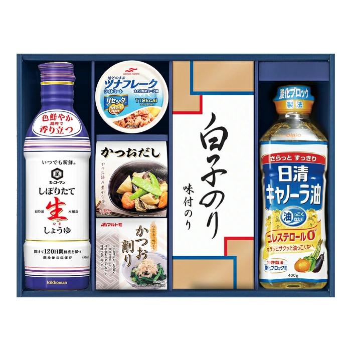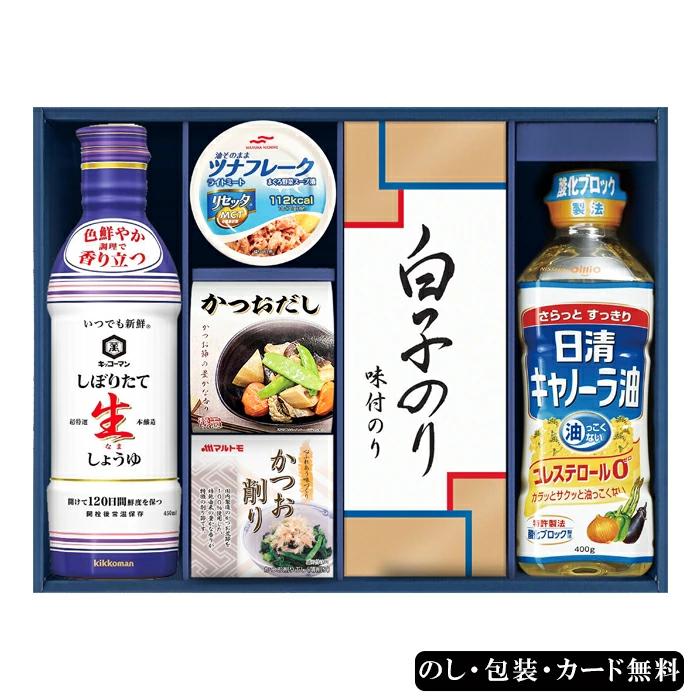 キッコーマンしぼりたて生しょうゆ450ml、シーラックかつおだし(4g×3)、マルトモかつおパック(0.7g×3)、マルハニチロ 油そのままライトツナリセッタ70g、白子のり味のり(3切5枚)、日清キャノーラ油400g×各1